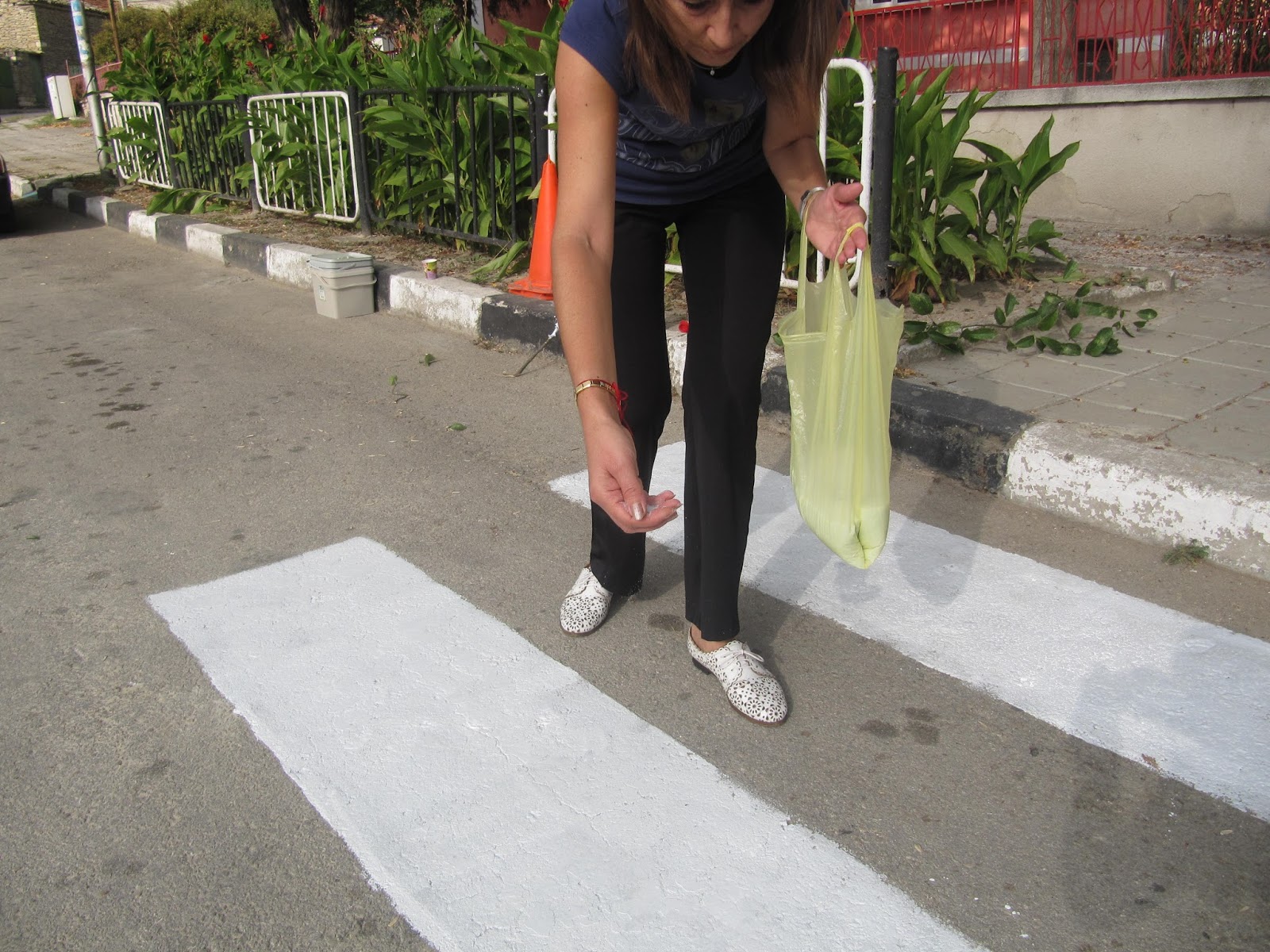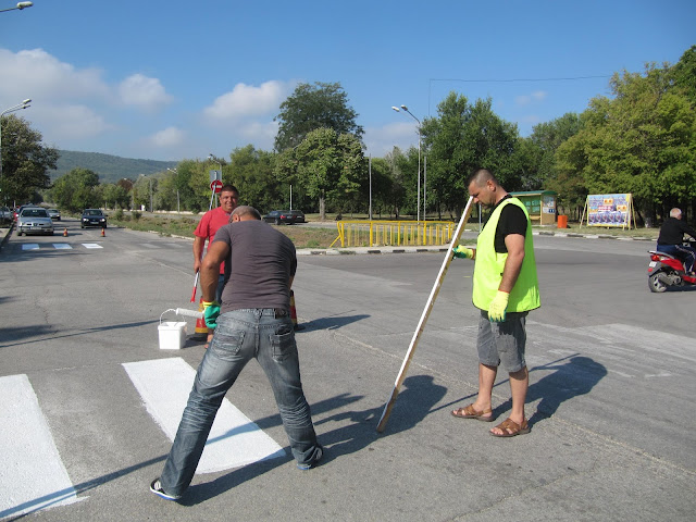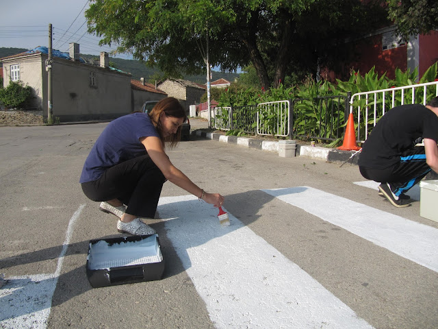 Маркировката на "зебрата" между Дневния център и Народно читалище "Просвета" бе толкова изтрита, че на места изобщо не се виждаше. Въоръжена с четки и валяци, "ударната бригада" за нула време освежи пътеката, а заместник-кметът я поръси със специални кристали, които светят през нощта.